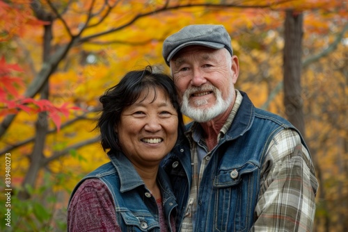Portrait of a blissful multicultural couple in their 50s wearing a rugged jean vest isolated on background of autumn leaves