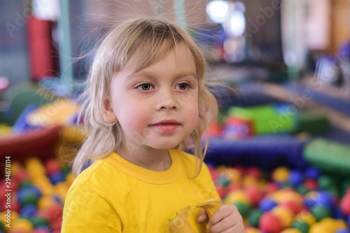 Portrait of a blond boy in a yellow t-shirt. The child smiles and plays in the children's playroom. Ball pool.