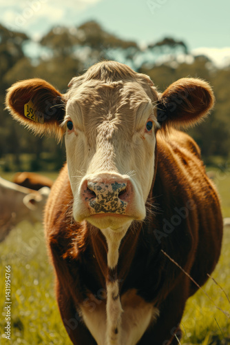 Portrait of a brown and white cow standing in a lush green field. A peaceful agricultural scene ideal for World Milk Day and rural life themes.