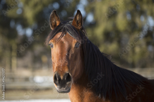 Portrait of a brown mare in winter
