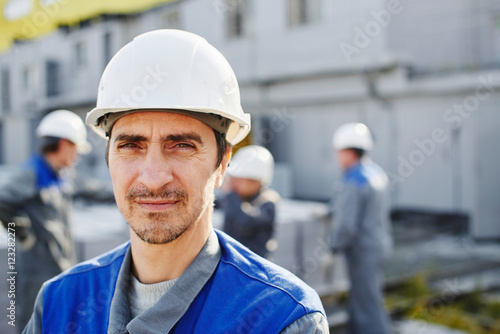 Portrait of a Builder in overalls and helmet on the background of a group of people around a cart with a brick