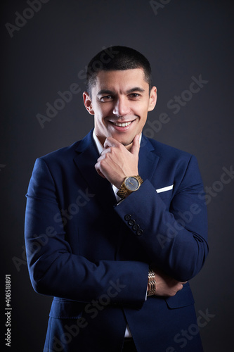 Portrait of a businessman in blue jacket on dark background in studio. man with short haircut. Young confident manager smiles