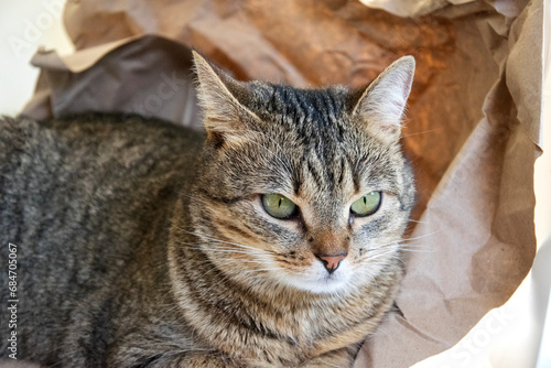 Portrait of a cat on a background made of crumpled Kraft paper. Cute tabby cat close-up. Portrait of a pet.