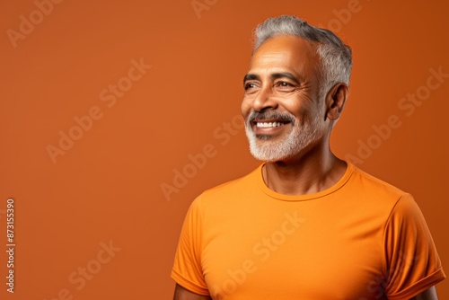 Portrait of a cheerful indian man in his 60s sporting a breathable mesh jersey over soft brown background
