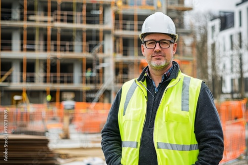 Portrait of a civil engineer in a safety vest at a construction site, Generative AI