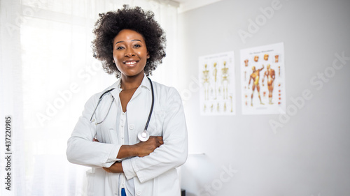 Portrait of a confident doctor working in a hospital. African American Healthcare Professionals. Portrait Of Smiling Female Doctor Wearing White Coat With Stethoscope In Hospital Office