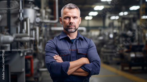Portrait of a confident engineer that is standing with arms crossed at the modern factory