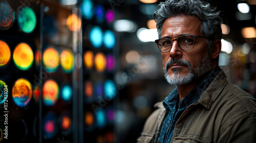 Portrait of a confident, stylish man with a beard and glasses in a vibrant urban setting.