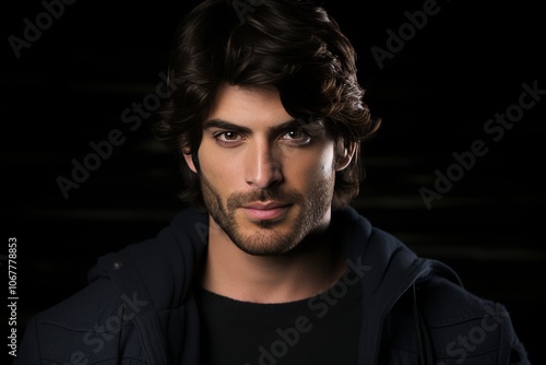 Portrait of a Confident Young Man on Black Background, Studio Lighting, Dark and Moody Stubble