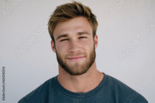 Portrait of a confident young man radiating charm and charisma against a minimalist backdrop reflecting modern masculinity and self-assuredness captured with clarity