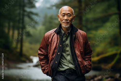 Portrait of a content asian man in his 70s sporting a stylish varsity jacket against a tranquil forest stream. AI Generation