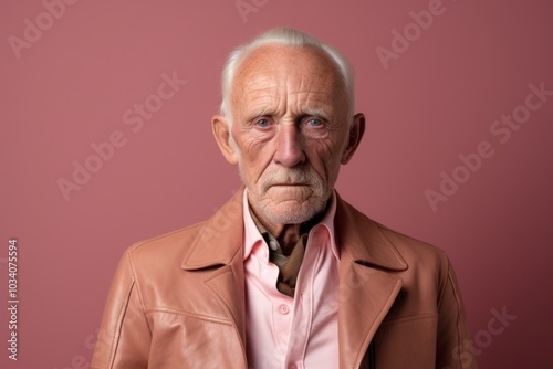 Portrait of a content elderly 100 years old man sporting a stylish leather blazer isolated in pastel or soft colors background