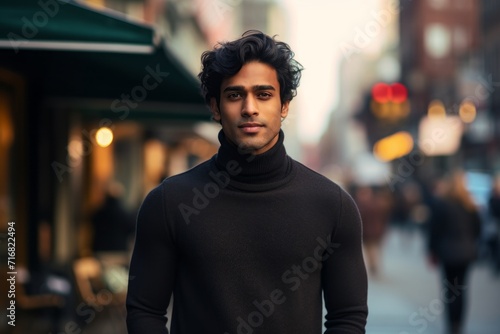 Portrait of a content indian man in his 20s wearing a classic turtleneck sweater against a bustling city street background. AI Generation