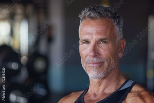 Portrait of a content man in his 60s donning a trendy cropped top in dynamic fitness gym background