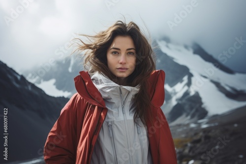 Portrait of a content woman in her 20s wearing a functional windbreaker against a snowy mountain range. AI Generation