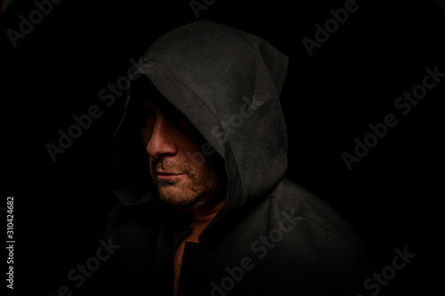 Portrait of a courageous warrior wanderer in a black cloak. Historical fantasy. Halloween
