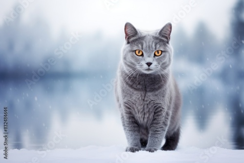 Portrait of a cute chartreux cat on backdrop of a frozen winter lake