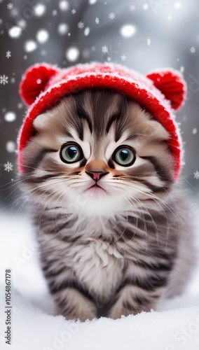Portrait of a cute Christmas kitten in a red knitted hat under the snow