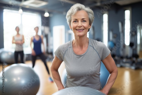 Portrait of a determined mature woman doing bosu ball exercises in a gym. With generative AI technology