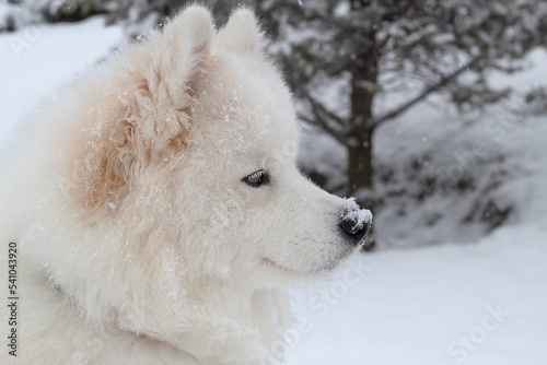 Portrait of a fluffy white dog in winter. Snowing. Portrait in profile. Copy space on the right