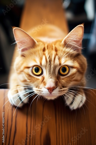 Portrait of a ginger cat on a wooden table. Shallow depth of field