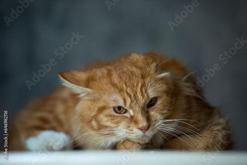 Portrait of a ginger fluffy cat making a funny face looking grumpy or angry