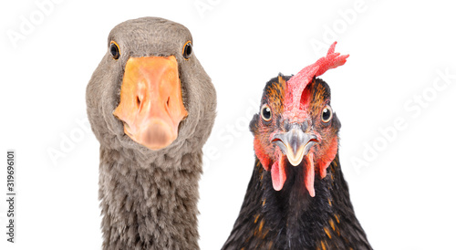 Portrait of a goose and chicken, closeup, isolated on a white background