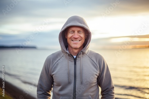 Portrait of a grinning man in his 40s sporting a comfortable hoodie in serene seaside background