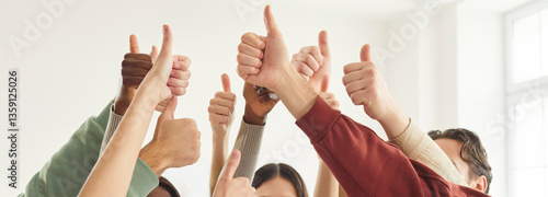 Portrait of a group of diverse people friends in casual clothes putting their arms up showing thumbs up sign. Students or coworkers men and women standing together with hands up. Banner.