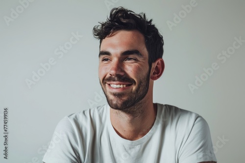 Portrait of a handsome smiling man with a beard in a white t-shirt