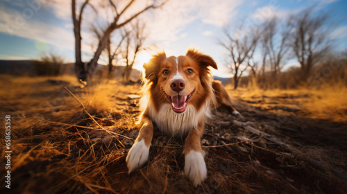 Portrait of a happy dog on a blurred background, beautiful lighting.
