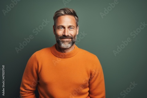 Portrait of a happy man in his 40s dressed in a warm wool sweater against a solid color backdrop. AI Generation