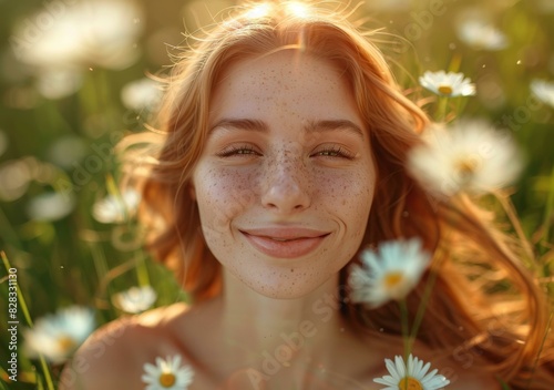 Portrait of a happy young woman with freckles and red hair, standing in a field of daisies and smiling.