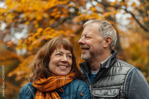 Portrait of a joyful couple in their 40s dressed in a breathable mesh vest isolated on background of autumn leaves