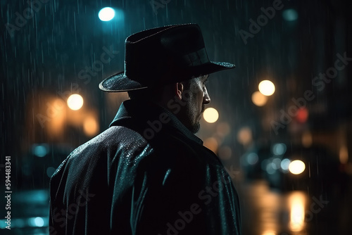 portrait of a male detective spy in hat and raincoat on street at night in rain. Generative AI