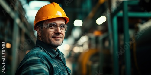 Portrait of a male engineer in a factory. He wears a collared shirt and looks confident. Generative AI