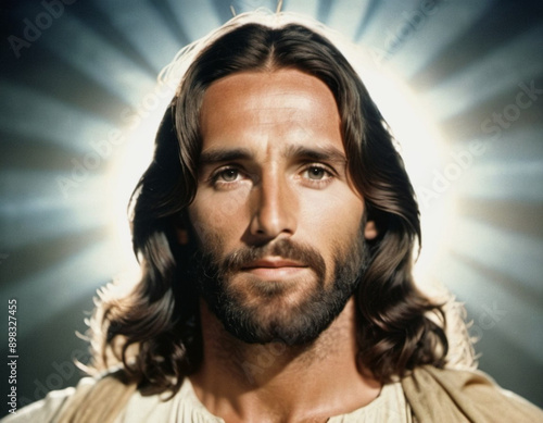 Portrait of a Man Dressed as Jesus. White robe. Long brown hair and beard. Man appears to be in his early 30s, and he has a serious expression on his face. Christian religion and faith. AI generated