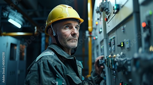 Portrait of a man in a helmet and work clothes standing in a power supply station, repair and adjustment by an electrician of an electrical panel hyper realistic