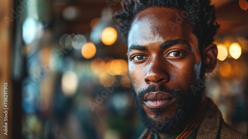 Portrait of a man with a textured beard and expressive eyes in a warm, softly lit indoor setting, capturing a moment of stillness and contemplation late in the evening