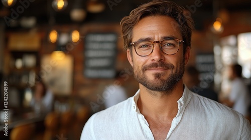 Portrait of a man with glasses and a beard in a cafe or restaurant setting with blurred background
