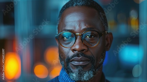 Portrait of a man with glasses showcasing confidence in a modern urban environment during the evening