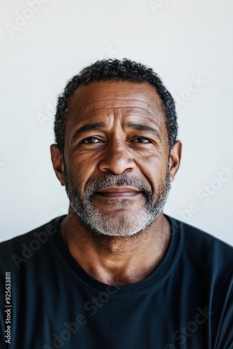 Portrait of a mature African American man with a serene expression and a salt-and-pepper beard, wearing a simple dark top against a neutral background.