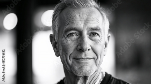 Portrait of a mature man smiling with confidence in a black and white style, healthy aging for men