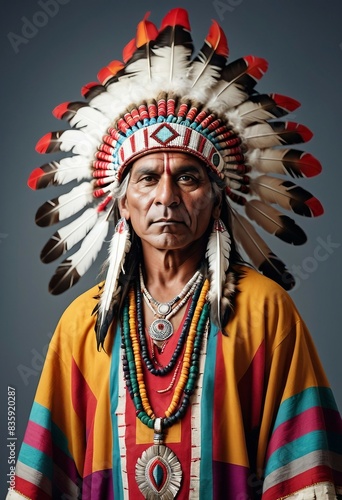 portrait of a muscled young American Indian tribal chief in traditional dress, isolated white background, copy space for text