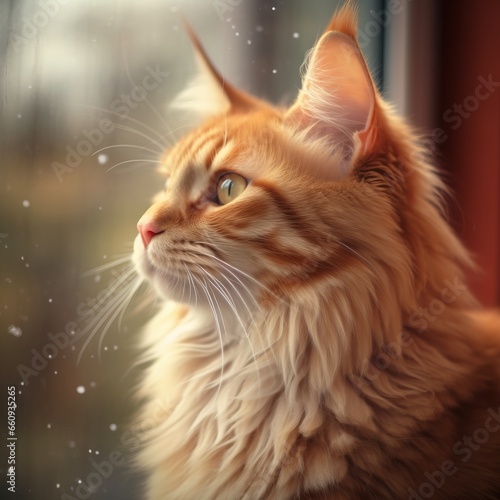 Portrait of a red Maine Coon cat sitting in a light room beside a window. Closeup face of a beautiful Maine Coon cat at home. Portrait of a grown red Maine Coon cat with thick fur looking out a window