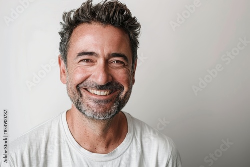Portrait of a satisfied man in his 30s smiling at the camera isolated in white background