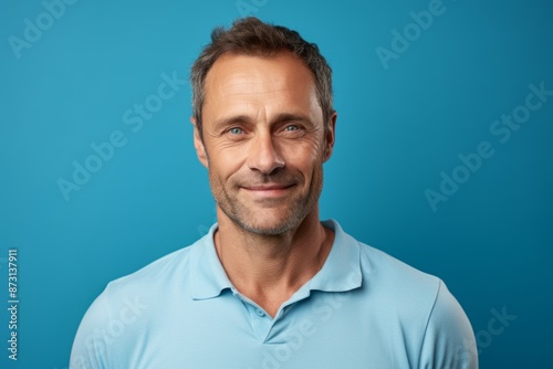 Portrait of a satisfied man in his 40s wearing a sporty polo shirt in soft blue background