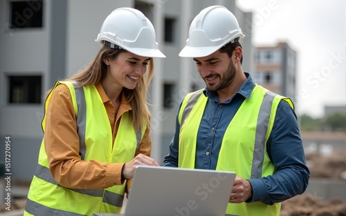 Portrait of a Site Manager Talking with General Operatives at a Residential Building Construction Area. Female and Male Employees Using a Laptop Computer to Oversee the Real Estate Project Plan