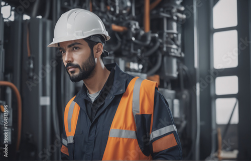 portrait of a skilled male maintenance engineer adorned in a professional uniform and helmet