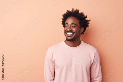 Portrait of a smiling afro-american man in his 30s sporting a long-sleeved thermal undershirt while standing against solid pastel color wall